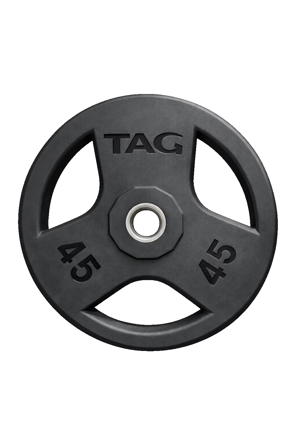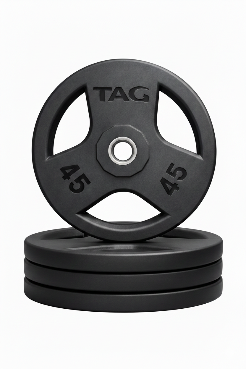 • 45, 35, 25 & 10 lb sizes feature comfortable tri-grip handle system; 5 and 2.5 lb. sizes are solid plates
